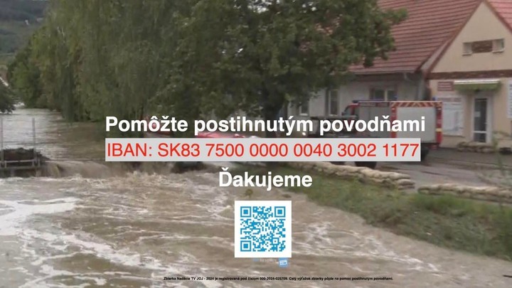 Prírodná katastrofa zasiahla Slovensko. Dážď a silný vietor vyčíňajú na viacerých územiach krajiny. Ľudia majú zaplavené domy, zničené majetky vetrom, obce sa trápia povodňami. Vo viacerých mestách utrpeli škodu aj historické pamiatky. Pomôcť ľuďom a obciam, ktoré musia situáciu riešiť môžete aj vy. Zaslaním prázdnej SMS v hodnote 3 € s DPH na číslo 855 v sieti všetkých mobilných operátorov pomôžete tým, ktorých zasiahla prírodná katastrofa. Cena SMS je konečná, spätná SMS nie je spoplatnená. Mobilní operátori odvedú celú sumu na zbierku. Zbierka Nadácie TV JOJ - 2024 je registrovaná pod číslom 000-2024-025709. Prispieť môžete aj na účet Nadácie TV JOJ zaslaním ľubovoľného príspevku.